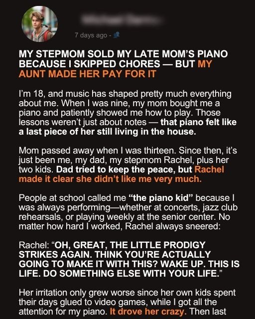 My Stepmom Sold My Late Mom’s Piano Because I Skipped Chores — But My Aunt Made Her Pay For It