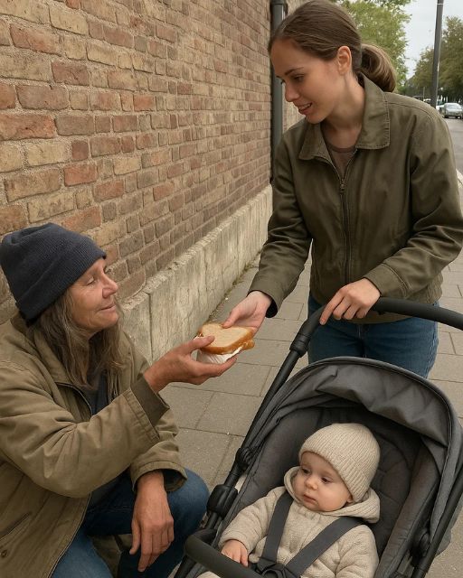 She Hadn’t Had a Full Meal in Days, but When She Saw a Young Mother Struggling, She Handed Her the Sandwich Someone Had Just Given Her