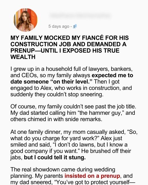 My Family Mocked My Fiancรฉ For His Construction Job And Demanded A PrenupโUntil I Exposed His True Wealth