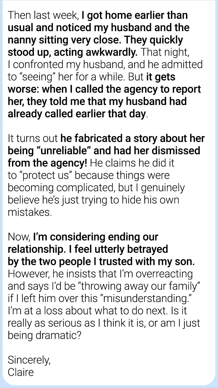 Finding out about infidelity can deeply wound any relationship built on trust and sincerity. For Claire, an upheaval occurred upon uncovering her husband’s affair with their trusted nanny. Struggling with feelings of betrayal from both her spouse and someone they depended on for family care, Claire wrote an open letter seeking guidance and clarity during this tumultuous chapter in her life.
