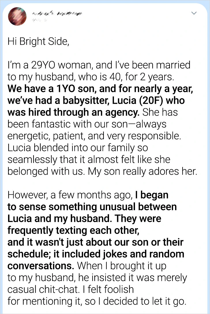 Before making any major decisions, itโs important to take a step back and assess the trust within your relationshipโnot just with your husband but also regarding the dynamics that included your nanny, Lucia. Attempt to gauge how long these behaviors might have been occurring and decide if and how trust might be restored.
