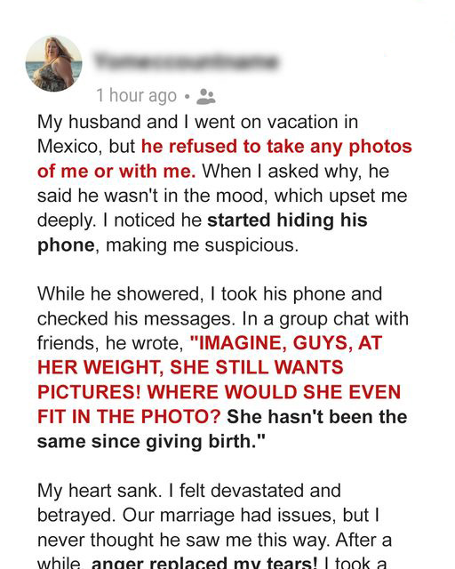 There it was, a group chat with his friends. And what I read made my blood run cold. He had written, “Imagine, guys, at her weight, she still wants me to take pictures of her! Where would she even fit in the photo? She hasn’t been the same since giving birth.”